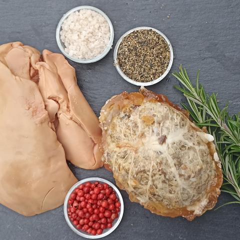 Epaule et poitrine de porc noir gascon, foie gras (25%), œufs, porto sel, poivre